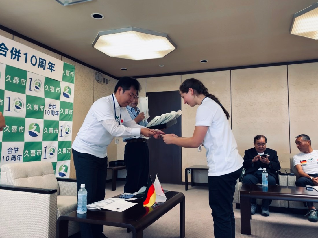 Danach schlüpften wir fix in unsere A-Kleidung, bevor es zum Bürgermeister der Stadt Kuki, Mr. Umeda ging. Auch hier wurden wir, wie überall, herzlichst begrüßt und nach dem Austauschen der Visitenkarten und Gastgeschenke einmal mehr von vielen Kameras fotografiert. Am meisten freuten sich wohl alle über die darin enthalten Fächer, um diese haben wor die Japaner nämlich bis dato immer beneidet bei diesen Temperaturen.