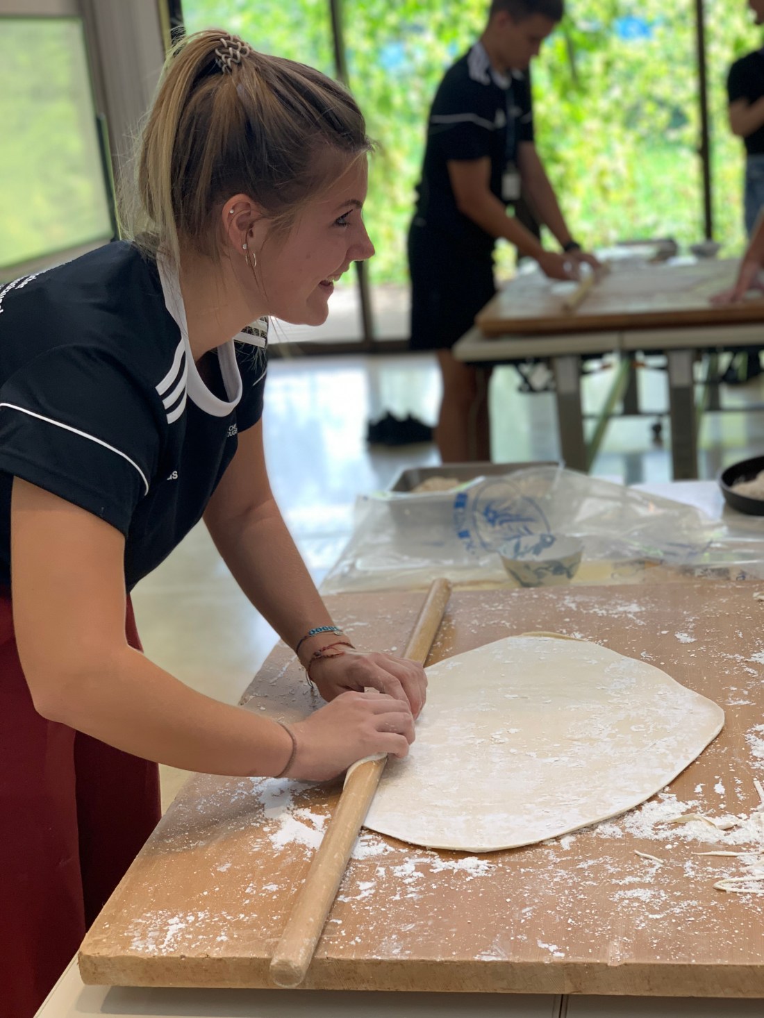 Wir nutzten die ungeplante Pause für einige Gruppenfotos, von denen es nie genug geben kann. Owen und Chris versuchten sich im „Jankenpoi“, was die japanische Version unseres Schnick-Schnack-Schnucks ist. Owen gewann deutlich, obwohl er eigentlich stets Schere genommen hat. Chris hatte wohl heute einfach kein Glück. So langsam ging es dann auch ans Essen zubereiten. Wir blickten gespannt auf die japanischen Schriftzeichen des Rezepts und übersetzten gemeinsam mit Moka alles. Weizenmehl, Salz und Wasser zusammenzubringen, erschien uns eine lösbare Aufgabe. Schritt 4 verwunderte uns jedoch sehr. Mit den „Füßen“ treten erschien uns nicht die geeignete Form der Zubereitung für Nudeln. Nach einer Einführung durch unseren Kochlehrer, der bereits mehr als 30 Jahre Erfahrung hatte, wurde uns jedoch klar, dass dies kein Scherz war und der Nudelteig tatsächlich mit den Füßen gestampft wird. Da am Ende ein sehr fester Teig entsteht, lässt sich dieser nur sehr schwer mit den Händen bearbeiten. Deshalb nutzen die Japaner die Kraft des ganzen Körpers, um ein optimales Ergebnis zu erhalten.