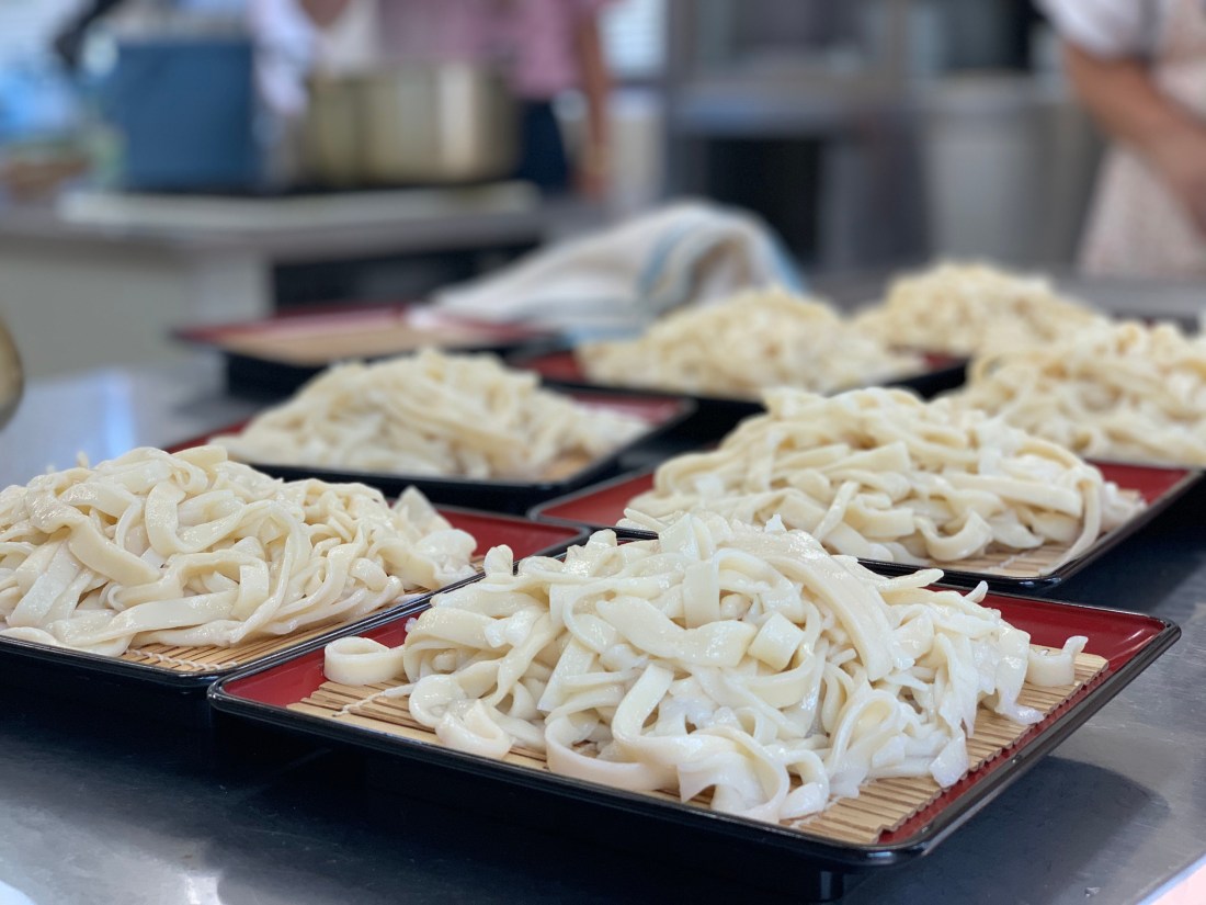 Da wir natürlich viel zu viel Mehl hatten, landete es nicht nur im Teig, sondern auch auf den T-Shirts. Teilweise ließen sich echte Kunstwerke auf den Shirts bestaunen. Aber auch die Udon Nudeln sollten ziemlich gut werden. Nach der zweiten oder dritten Erklärung ging uns das Teig kneten auch gut von der Hand, so dass die Udon Nudeln am Ende vermutlich für die gesamte deutsche Delegation (125 Teilnehmer) gereicht hätten. wie in Japan üblich, gab es aber noch viele weitere Köstlichkeiten. Dazu zählten unter anderem selbst gerollte Reisbällchen.
