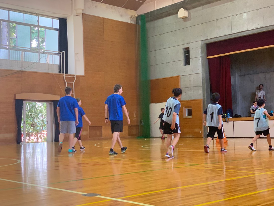 Nach einer kurzen Umziehpause ging es mit Sport weiter. Und zwar spielten wir Onigokko. Bei diesem Spiel gibt es immer zwei Mannschaften mit je sechs Spielern. Das Spiel beginnt, indem die sechs Spieler der beiden Mannschaften auf alle vier Ecken des Spielfeldes aufgeteilt werden. Jede Mannschaft darf dabei nur auf die beiden eigenen Ecken, dabei ist es egal, ob man 3 zu 3 oder 4 zu 2 oder 1 zu 5 aufteilt, Hauptsache jeder hat eine Ecke. Jede Mannschaft hat eine Art Hut, am Ende ihrer eigenen Hälfte in einem Kreis, den sie verteidigen muss. Ziel des Spieles ist es, an den Hut der gegnerischen Mannschaft heran zu kommen. Verlässt man die eigene Spielhälfte, um an den Hut auf der anderen Seite zu gelangen, kann man von den dortigen Spielern mit beiden Händen angeschlagen werden, muss zurück in seine Ecke und darf erst danach wieder neu angreifen. Unsere Mannschaften bestanden immer jeweils aus dreien von uns und drei Kindern. Onigokko hat uns am Ende allen so viel Spaß gemacht, dass wir gar nicht mehr aufhören wollten es zu spielen und manche waren regelrecht traurig, als die Zeit rum war. Am Ende des Spieles bekamen wir alle sehr erfrischende, mit Eiswasser getränkte Lappen, die wir uns auf den Kopf oder in den Nacken gelegt haben, was wirklich nötig war bei der Hitze; Getränke standen wie immer auch ausreichend zur Verfügung.
