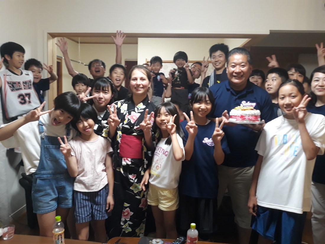 Nach der ganzen Aufregung gab es zum Verdauen erstmal Essen. Auf dem Tisch standen Sushi, Hähnchen, Salat, Pizza und noch eine ganze Menge andere Sachen. Als ich dann dachte, dass nichts mehr weiter in mich rein passt, sonst müsste ich platzen, bekam ich vom Trainer der Basketballmannschaft ein Paket überreicht, dass ihm meine Gastmutter gegeben hatte. Darin war ein Yukata als Geschenk für mich und als ich den angezogen hatte, haben wir alle zusammen ein Foto gemacht und es kam Kuchen, auf dem „Willkommens-Carolin“ und „Einmal im Jahr“ drauf stand. Da musste ich natürlich doch noch weiter essen (und ich bin nicht geplatzt).