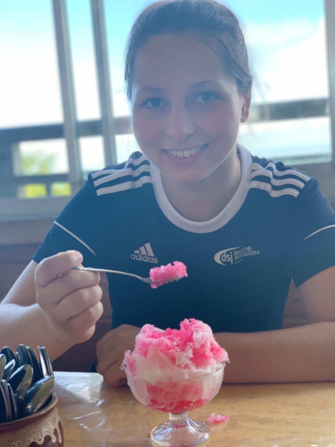 Nachdem wir wieder runter geklettert sind, gab es vor der Seilbahn, die zurück ins Tal führte, erstmal ein Eis. Doch nicht irgendein Eis, sondern Crashed ice mit Erdbeersoße, superlecker.